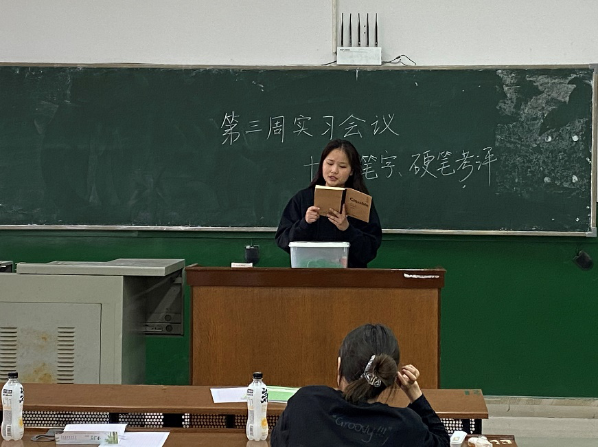 会议伊始,姚雅萍对前面两周的模拟实习情况进行了总结,并提出了接下来模拟实习任务的三点要求,一是大家需要及时完成每周布置的作业;二是每人须在模拟实习期间完成硬笔字帖一本;三是要加快队伍的模拟实习进度,争取在有限的时间里更好的完成实习任务。