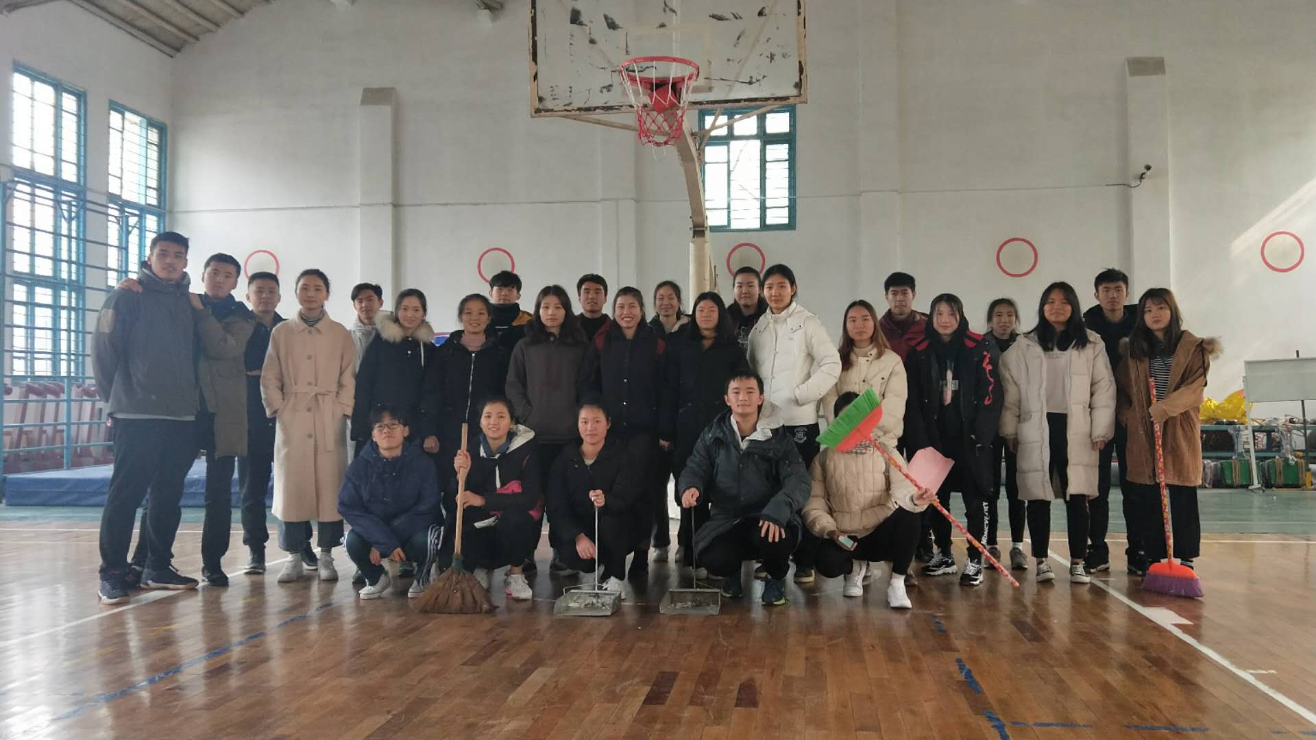 第六党小组主要负责老体操房、老排球馆和老篮球房的卫生打扫。活动开始,在组长的组织下,第六党小组一行前往老体操房、老排球馆及老篮球馆,服从安排,分工合作;男生负责各项体育器材的摆放,女生负责场馆垃圾的清扫。在活动过程中,大家相互配合,女生三人一个小组,一个人进行打扫,一个人协助打扫,另一个人负责拍照;男生五人一个小组,搬运大型体育器材,一人负责拍照。经过男女分工合作,大家高效率的完成了劳动任务。老体操房、老排球馆和老篮球馆的整体卫生变得更清洁、整齐。最后,第六党小组在老篮球馆进行合影留恋。