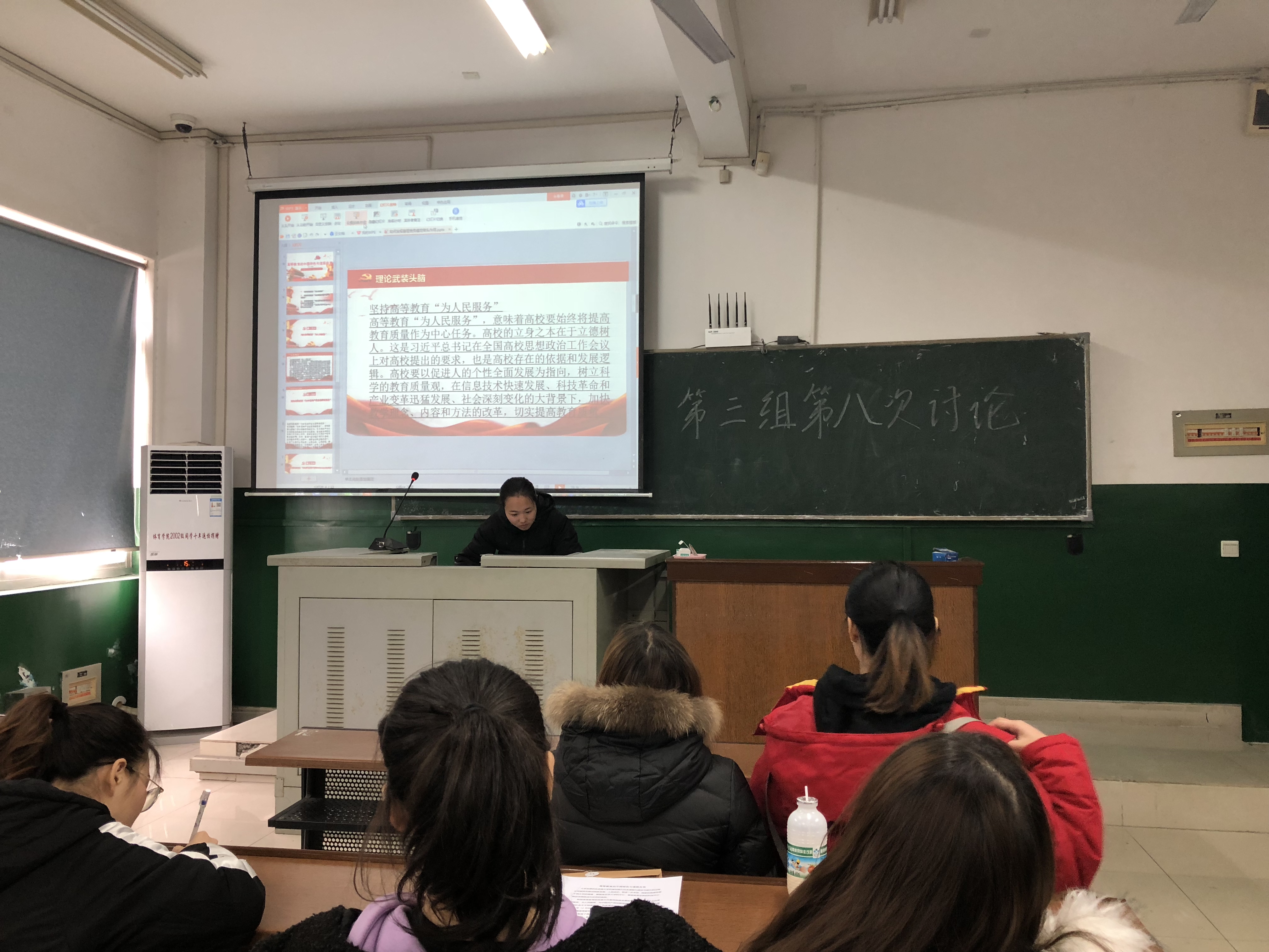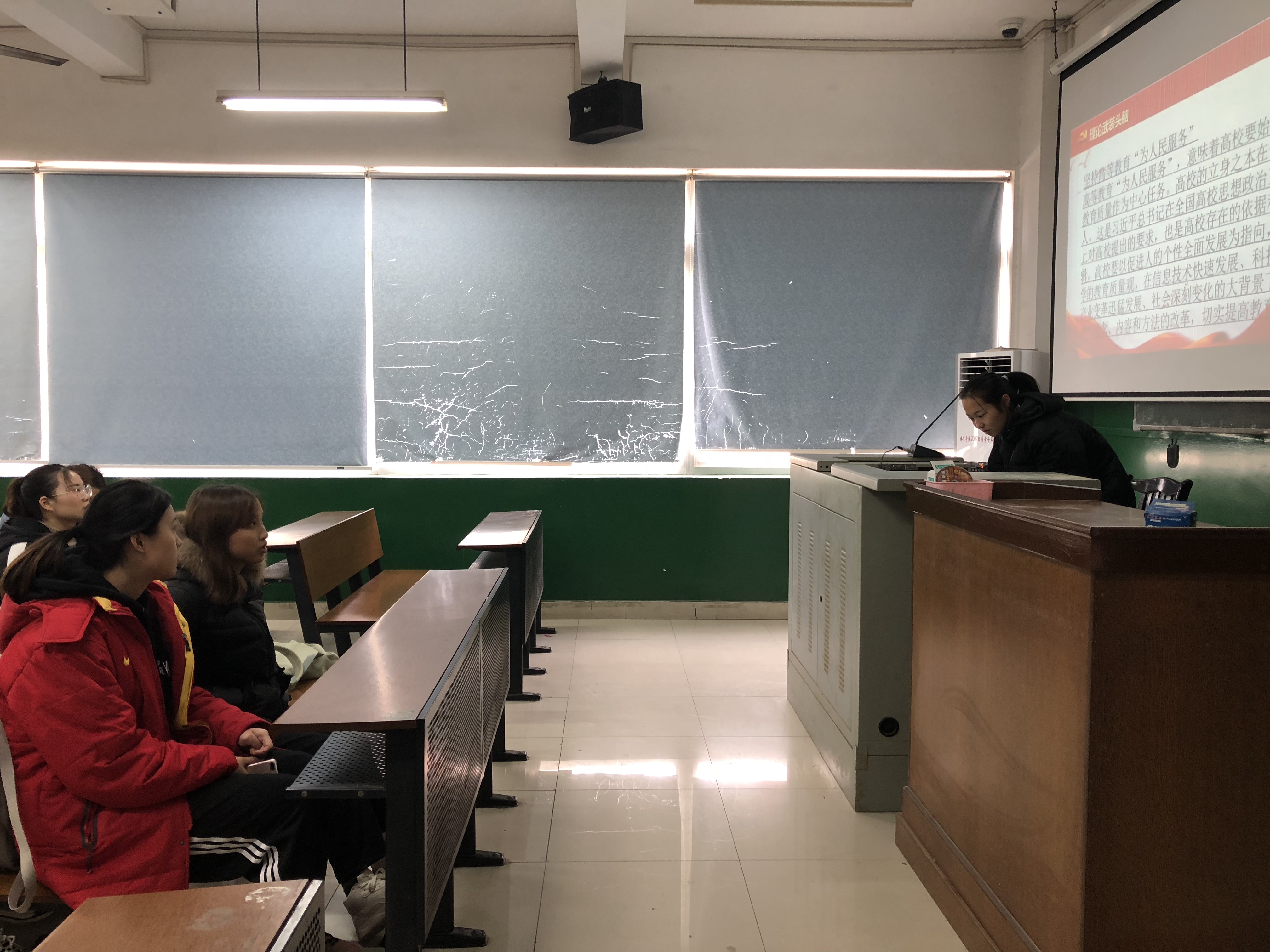 会上,杨金灵通过讲解PPT的形式从坚持高等教育“为人民服务”、坚持高等教育“为中国共产党治国理政服务”、坚持高等教育“为巩固和发展中国特色社会主义制度服务”、坚持高等教育“为改革开放和社会主义现代化建设服务”四个部分进行阐述。