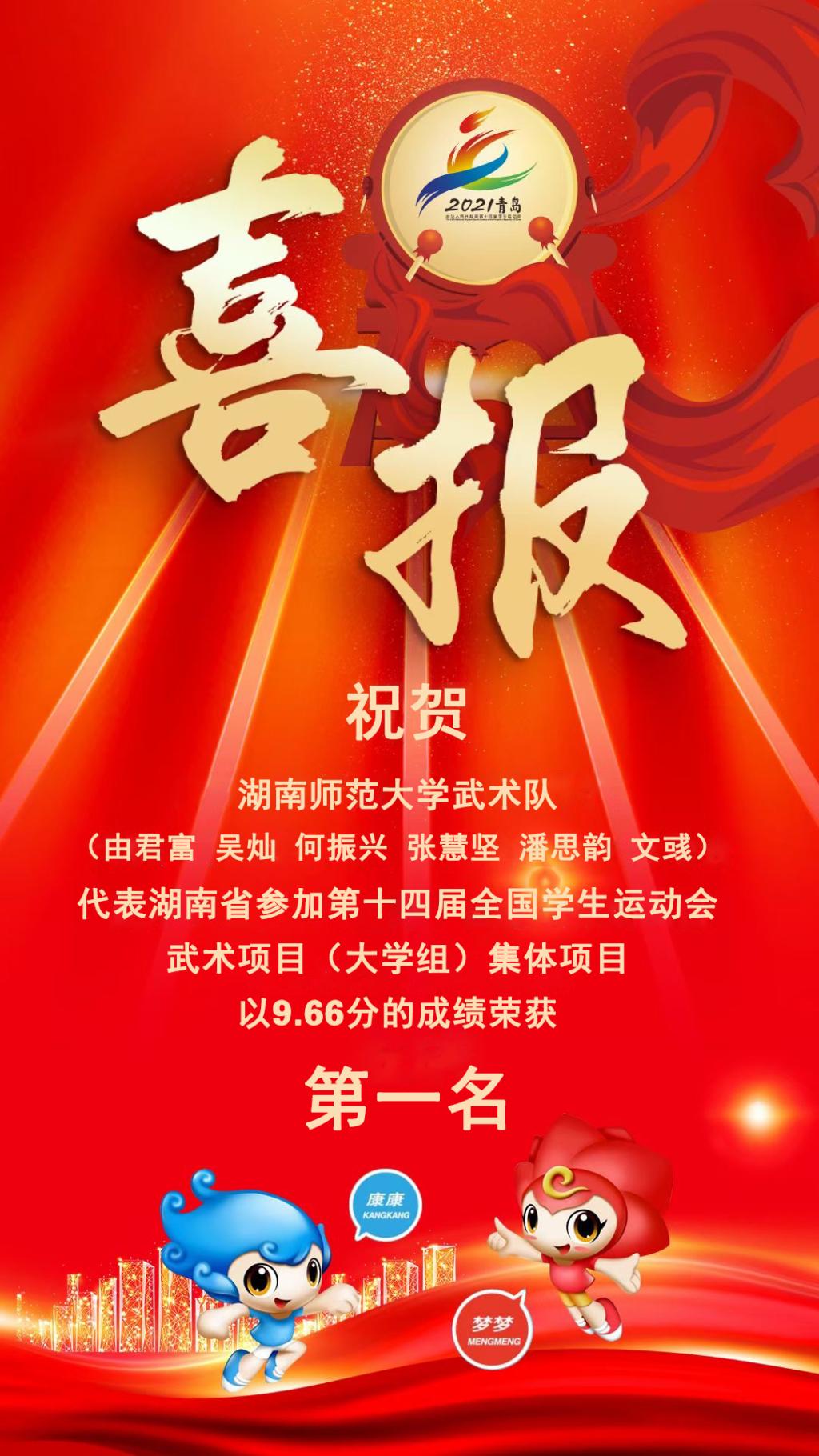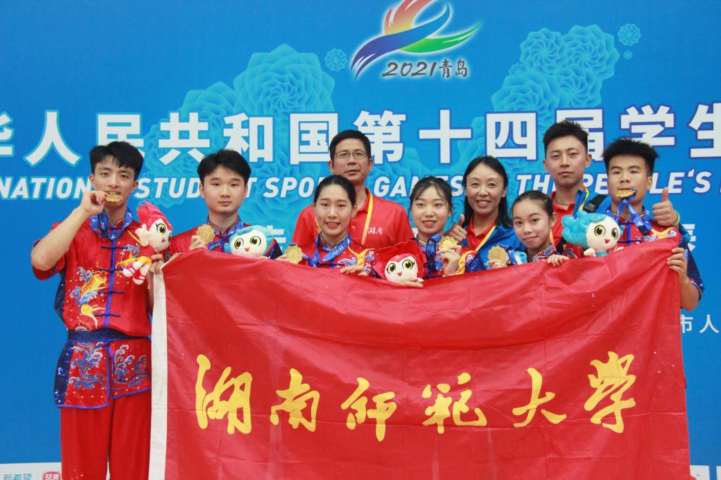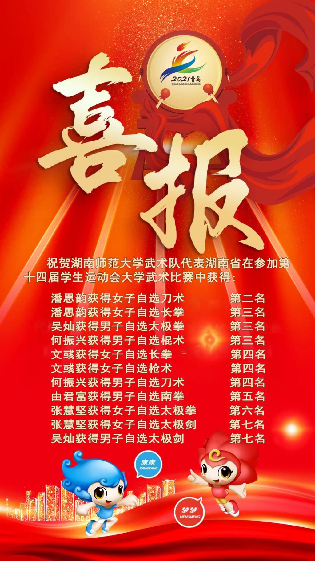 公司武术队在校领导和院领导的大力支持下,由公司党委副书记李波担任领队,雷军蓉、杨健男两位老师担任教练,带领6名队员征战学运会赛场,同时也代表湖南省大学组参赛。战鼓擂响,旗帜飘扬,运动健儿们始终坚持着“厚载博学、行健自强”的体院精神,奋力拼搏,经过三天的激烈角逐,不畏强手,奋勇争先,取得了1金1银3铜等荣誉,不仅表现了高超的竞技水平和湖南老员工精神风貌,更展现出湖师大学子的夺人风采,续写了武术与民族传统体育新的篇章!在此由衷的感谢领导的大力支持,佳绩的背后离不开领导和老师的关怀与帮助。以梦为马,不负韶华,民传学子将继续秉持师大精神砥砺前行,争取再创辉煌。