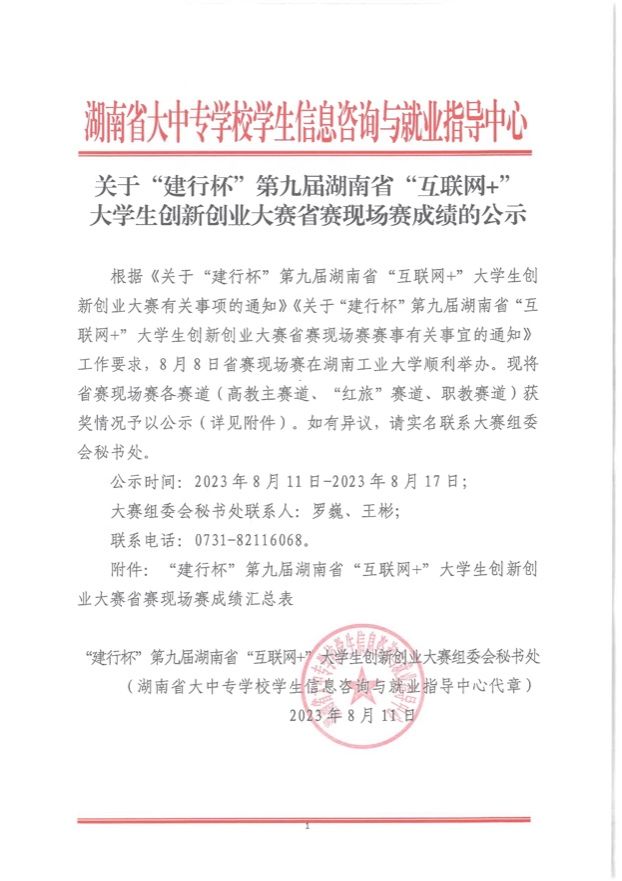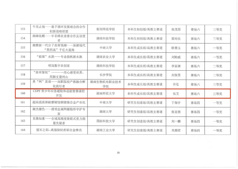 此外,湖南省教育厅发布了《关于“建行杯”第九届湖南省“互联网+”老员工创新创业大赛省赛现场赛成绩的公示》,公司由2019级体育教育(中外合作办学)专业伍艾等员工团队创作,夏禹、李皓两位老师指导的参赛项目《CEPF青少年应急避险体适能智慧课程开发》在大赛中荣获本科生成长组/高教主赛道湖南省三等奖,目前已推送参与国赛评选。