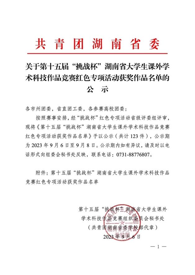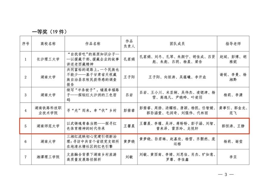 近日,由共青团湖南省委、湖南省教育厅、湖南省社会科公司、湖南省科学技术协会、湖南省员工联合会共同主办的第十五届“挑战杯”湖南省老员工课外学术科技作品竞赛红色专项活动获奖作品名单发布,公司由2021级武术与民族传统体育专业王馨晨等员工团队创作,郭恒涛、王静两位老师指导的参赛项目《以武铸魂青春当燃——探寻红色体育精神的时代传承》在大赛中荣获湖南省一等奖,取得公司该项赛事省赛零的突破,目前正在冲击国赛阶段。