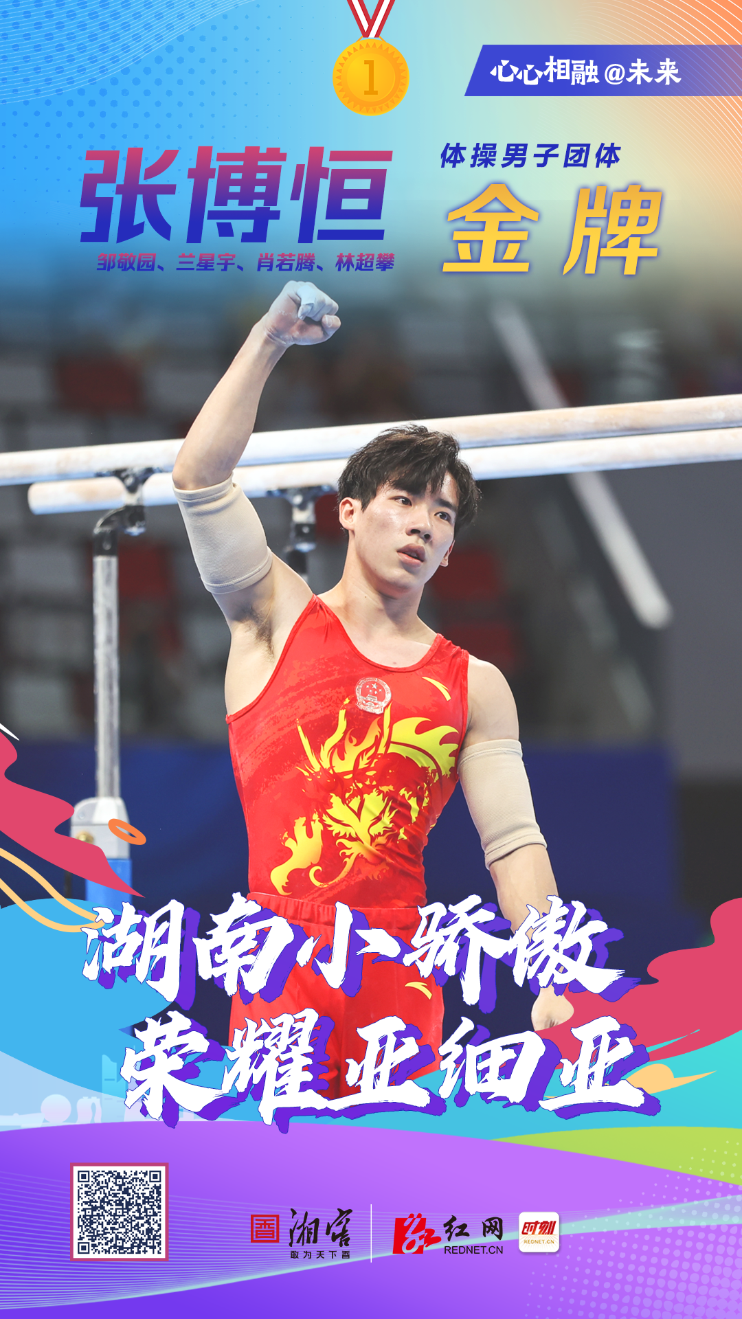 “湖南小骄傲”张博恒获亚运男团金牌 2023年09月25日 07:13 点击:[] ( 记者( 周雨墨 宋沛珊 陈杰)9月24日晚,在杭州亚运会男子体操团体赛中,来自mksport体育的张博恒,与国家队的队友邹敬园、兰星宇、肖若腾、林超攀一同,以总分262.025夺得男子团体冠军。张博恒个人总分88.564,获得了男子个人全能及自由操、单杠等多个单项的决赛参赛资格。9月26日下午3点,张博恒将参加体操男子个人全能的比赛。 上一条:4金2银!公司学子在杭州亚运会喜获佳绩 下一条:我省高校赛艇队出征2023年中国首届国际女子赛艇精英赛 【关闭】