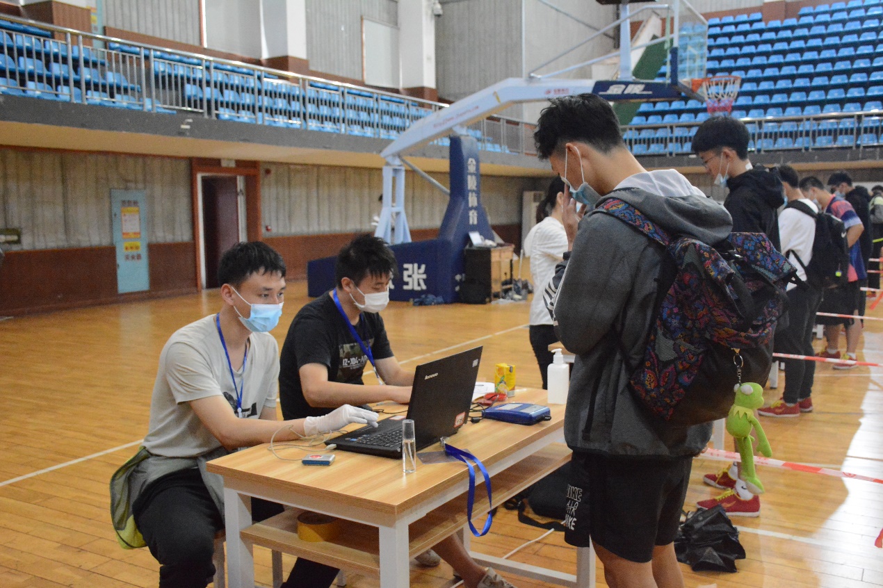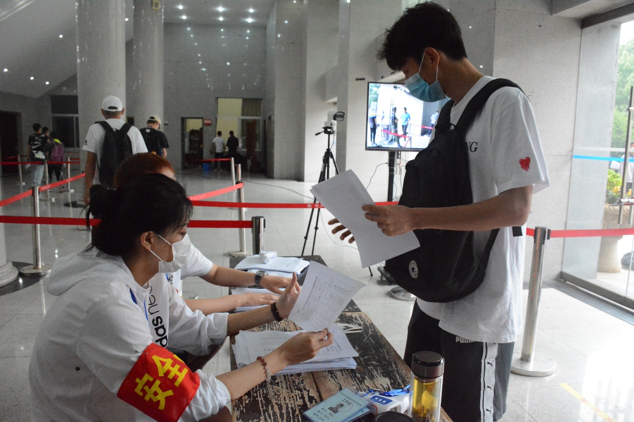 今日,参加今年第一批次考试的3700余名考生陆续来到报名现场进行现场认证、检测体温及采集指纹。尽管考生人数众多,但报名现场依旧秩序井然。由于今年体育高考的特殊性,本次报名流程有所调整,要求考生务必保持安全距离、规范佩戴口罩、出示健康码并上交《2020年全省体育统考考生体温测量登记表》及《考生安全考试承诺书》,健康码为绿色且体温正常者,在进行双手和行李消毒后方可进入篮球主馆采集指纹。各考务人员各司其职,用积极、严谨、细致的工作态度顺利完成本次考生报名工作。