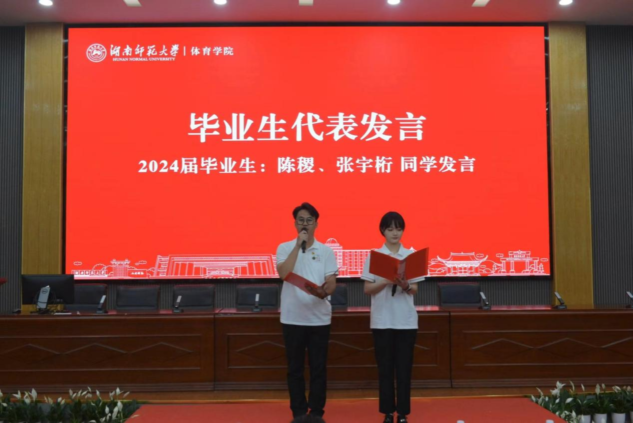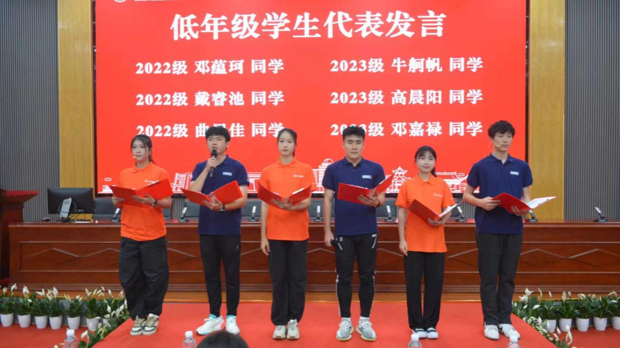 在校生代表高晨阳、邓蕴珂、戴睿池、曲思佳、牛舸帆和邓嘉禄发言,代表低年级同学祝贺2024届全体本科毕业生顺利完成学业、同时成功迈入人生下一阶段。六位同学表达了对学长学姐的尊敬、祝福与不舍,更表达了期望各位学长学姐可以在不同领域继续闪闪发光的祝福。