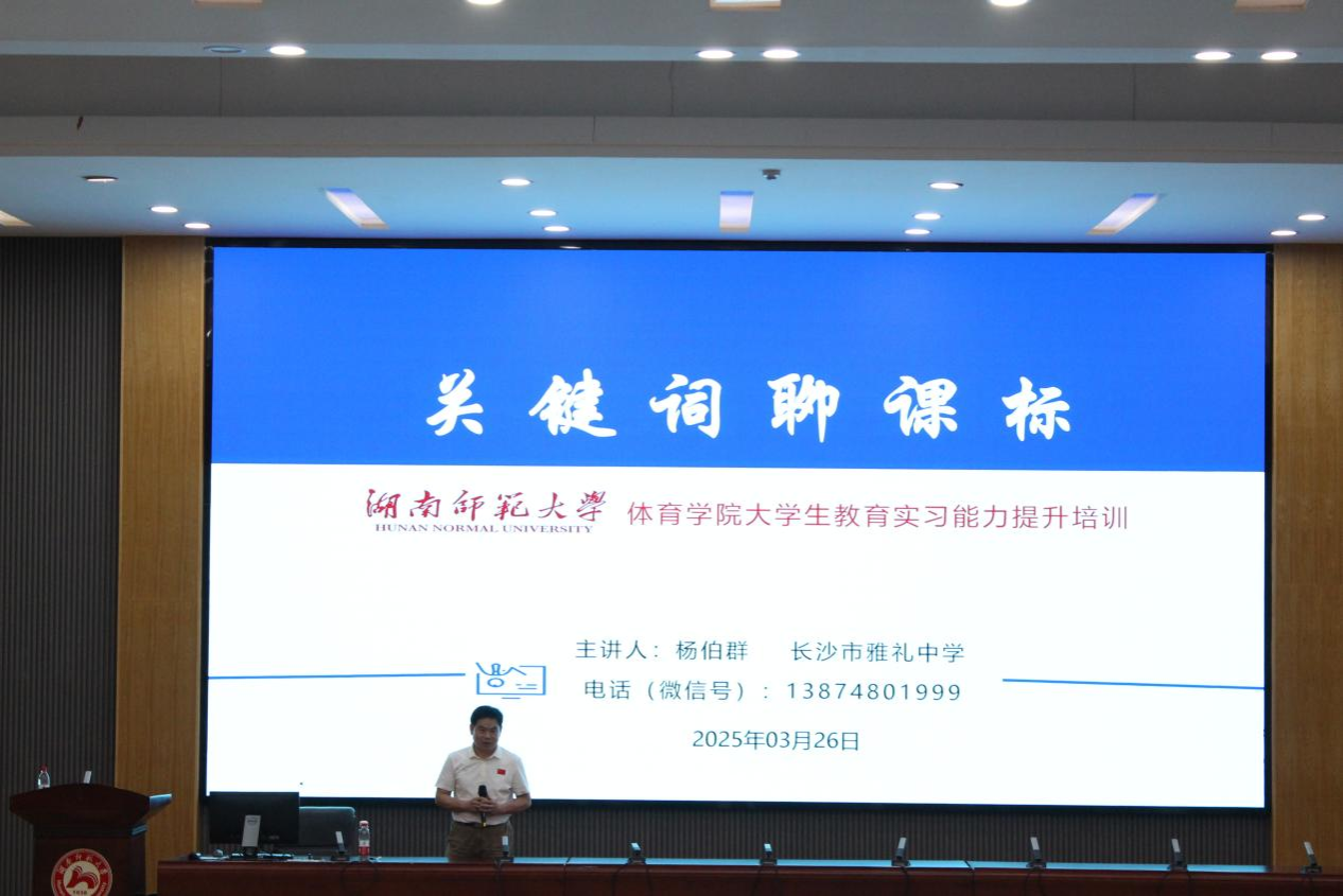 2025年3月26日晚,公司于鸿健楼二楼多媒体报告厅召开“关键词聊课标”为主题的教育专家培训讲座,旨在提升湖南师大2022级体育专业员工的教育实习能力,为他们未来投身教育工作筑牢基础。本次讲座由长沙市雅礼中学体育教师杨伯群主讲。各系部、教务办、学工办教职工代表、实习队全体队员出席此次会议。此次讲座由学工办主任夏禹老师主持。